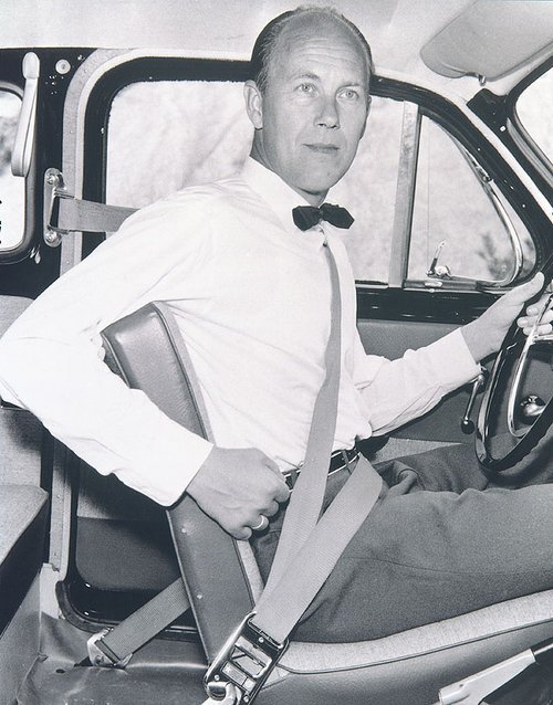 同样的,今天几乎在每辆市售车上都可以看得到的V型3点式安全带,也是这家瑞典车厂的伟大创举。3点式安全带是1959年Volvo工程师Nils Bohlin的创新发明,能比传统二点式安全带提供更好的固定及防护,因为传统二点式安全带,固定点在乘客的臀部两侧,并以此两固定点连接越过腹部的安全带,所以对于乘客上半身的固定作用较差,煞车过程中,腰部会发生严重的前倾,失去其保护作用。而V型3点式安全带,以驾驶座为例,安全带是从左肩延至胸前斜下横跨过胸口至右臀部侧边,再扣入固定点,并于绕过固定点后横过驾驶者腹部直至左臀部,最后连结至座椅侧边靠近地板的固定点,整体呈现V字型。於是当车身发生撞击时,安全带可将驾驶、乘客固定于座椅之上,避免人体与车内结构產生碰撞,并能分散力道于V字型的两边上,且提供足够的固定性,加上Volvo虽然握有这项专利,但却大方地免费与所有车厂共享这个科技,所以至今所有车用安全带几乎都仍保留着V型3点式的设计。