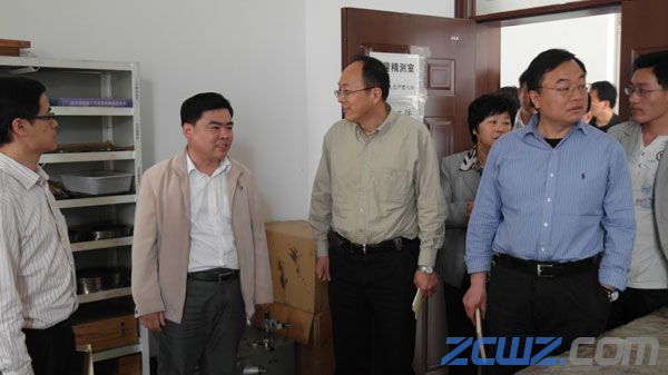 燕总(左二)陪同杨总(右一)参观凯美瑞精密计量检测中心